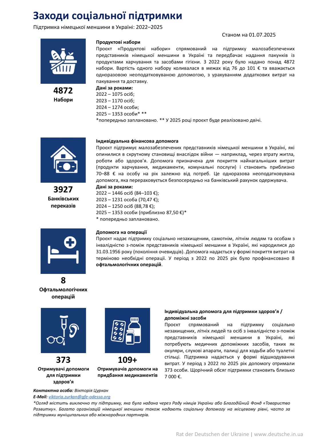 Пропонуємо ознайомитися з узагальненим оглядом соціальних ініціатив, які реалізовувалися Радою німців України та Благодійним Фондом «Товариство Розвитку» у 2022–2025 роках. Це справді вражаючий результат спільних зусиль!